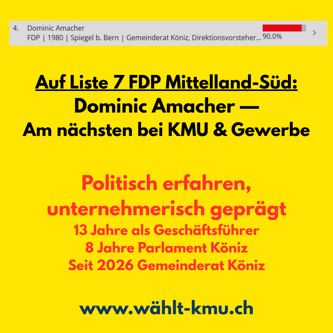 Auf Liste 7 FDP Mittelland-Süd: Dominic Amacher — m nächsten bei KMU & Gewerbe